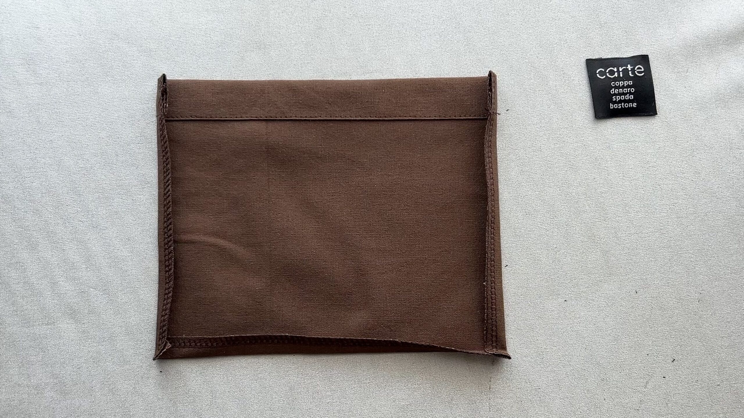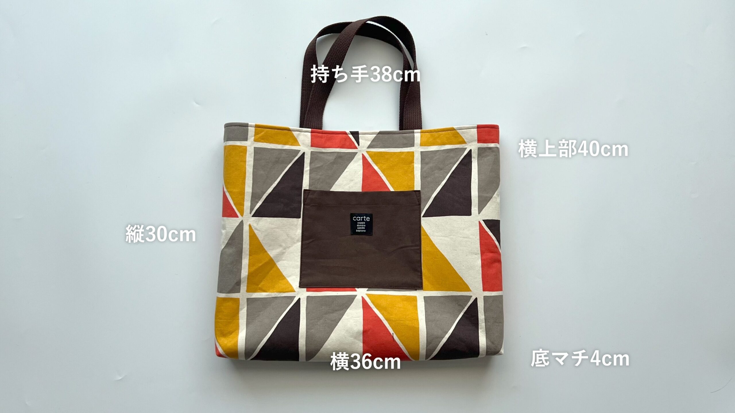 デザインのアクセントとして、タグ付きのポケットを付けています。これはお好みで省略することもできますので、初心者さんはまずポケットなしで作ってみてください。