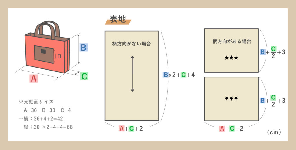 - 柄に上下方向がない場合:横 A + C + 2cm 、縦 B × 2 + C + 4cm …1枚