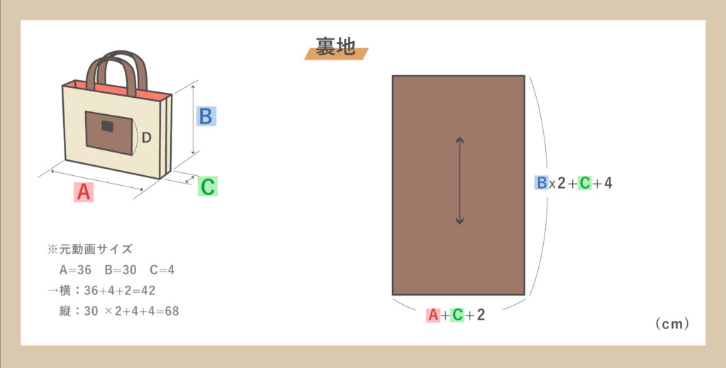- 裏地: 横 A + C + 2cm 、縦 B × 2 + C + 4cm …1枚