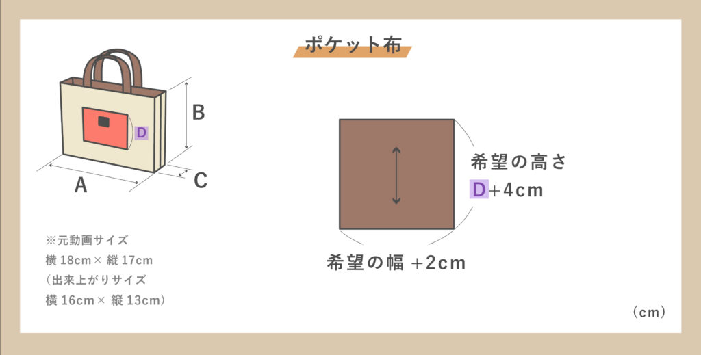 - ポケット布(お好みで): 横 希望の幅 + 2cm 、縦 希望の高さD + 4cm を1枚。