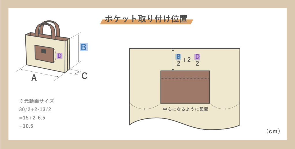 寸法変更の場合、表地の上の辺からB/2+2-D/2cmの位置に配置してください。