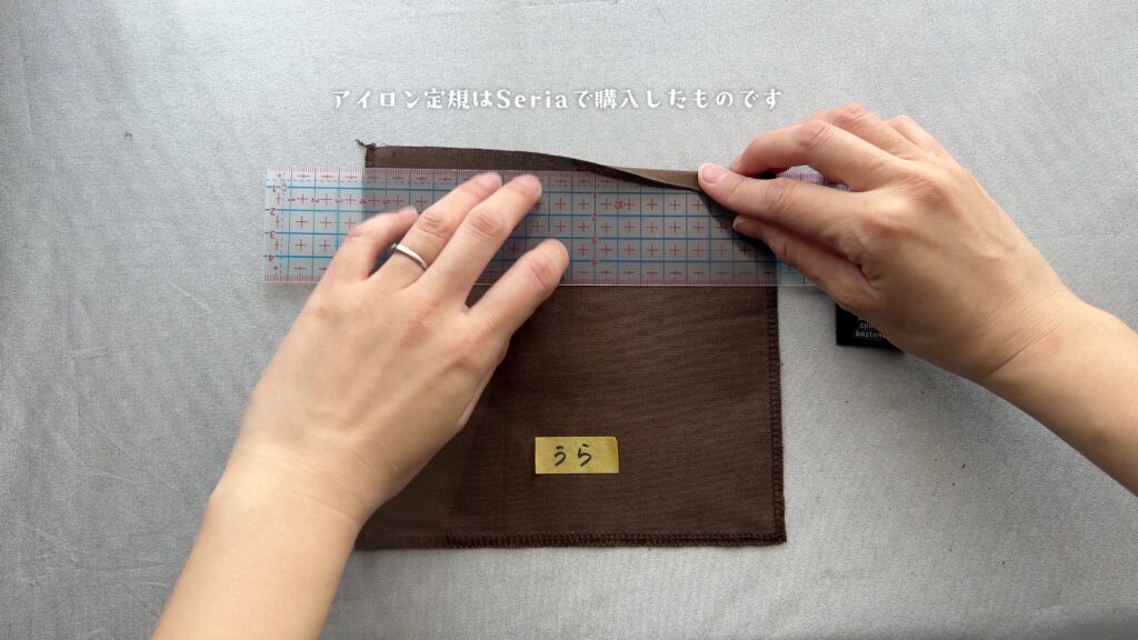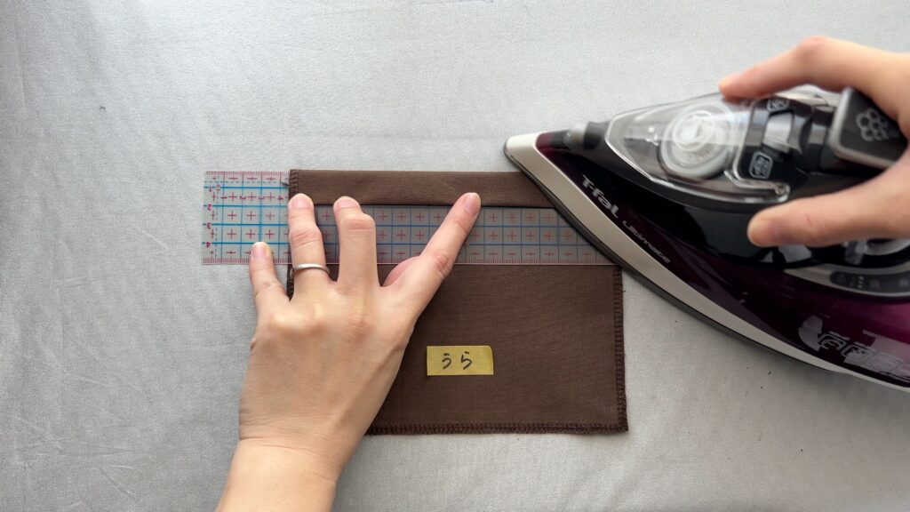 - ほつれ止めをしていない上側の辺を、生地の裏側を上にしてアイロンで1cm折ります。