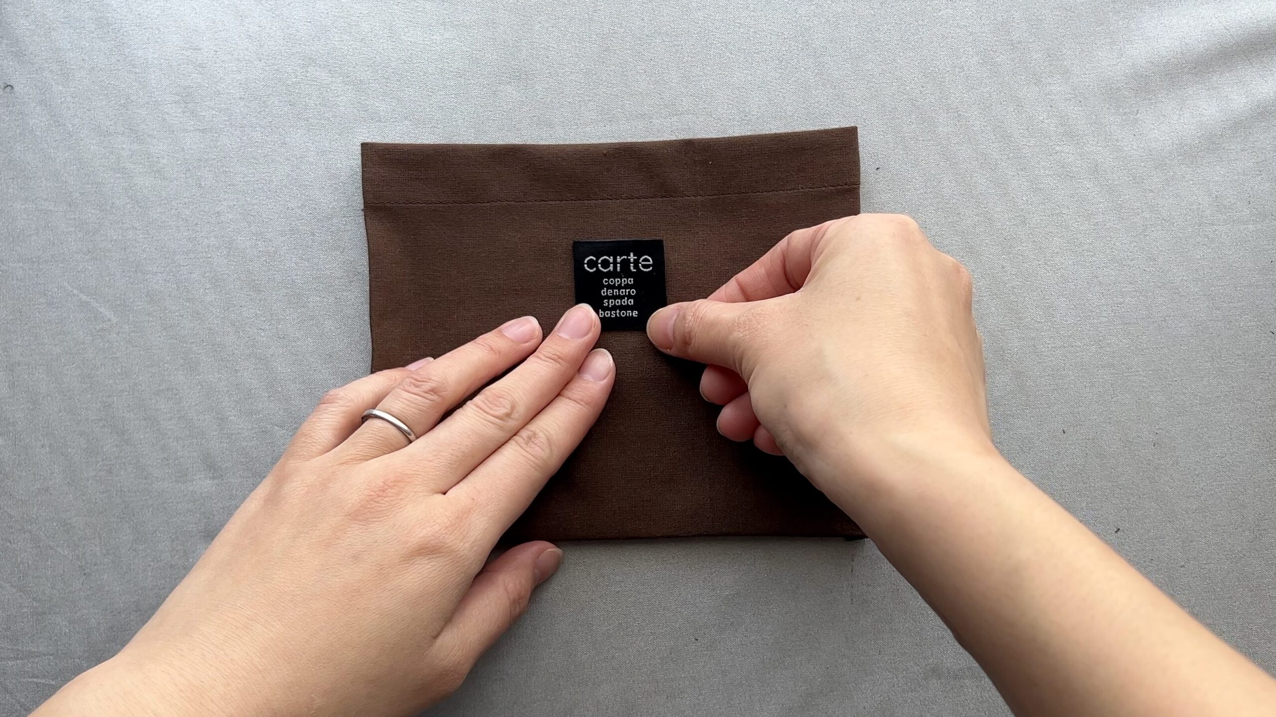 - 表側に返して、タグを付ける場合はバランスを見て位置を決めます。動画では2.8cm四方のタグを上から3cmの位置につけました。