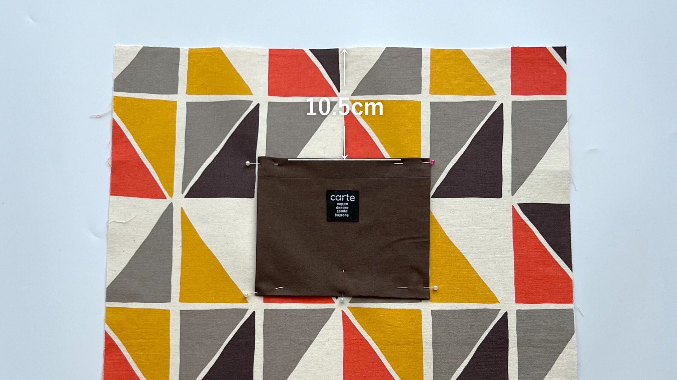 - ポケットを表地に付けます。上から10.5cmの位置に印をつけ、横方向は表地の中心に合わせてマチ針で固定し、縫い付けます。