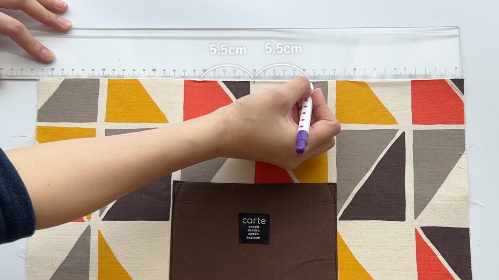 生地を横方向に半分に折って印をつけると簡単です。 - さらに中心の印から、左右にそれぞれ5.5cmずつ離れた位置にも印をつけます。合計3ヶ所に印がつくことになります。