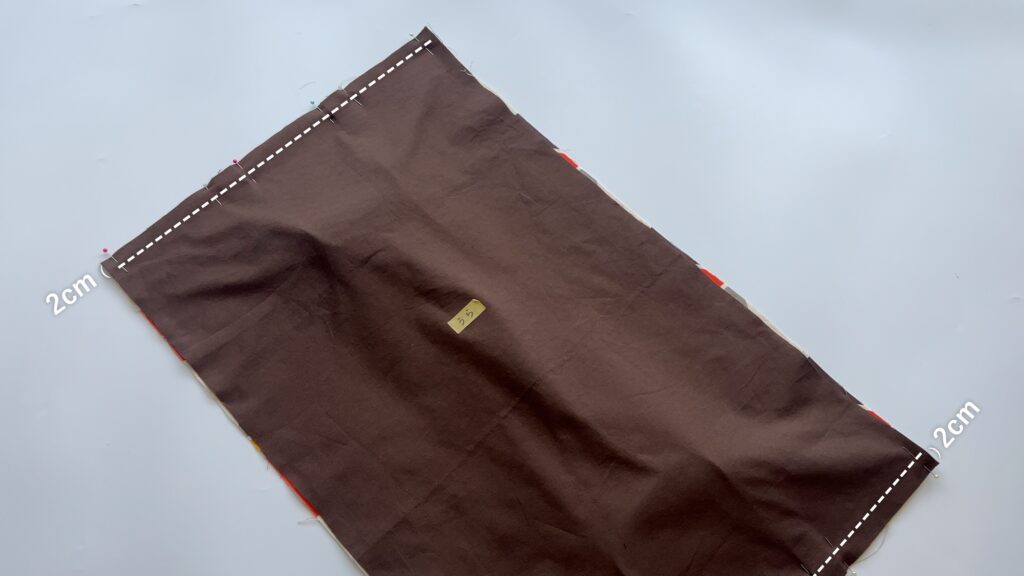 - マチ針やクリップで固定し、端から2cmの位置を直線縫いします。