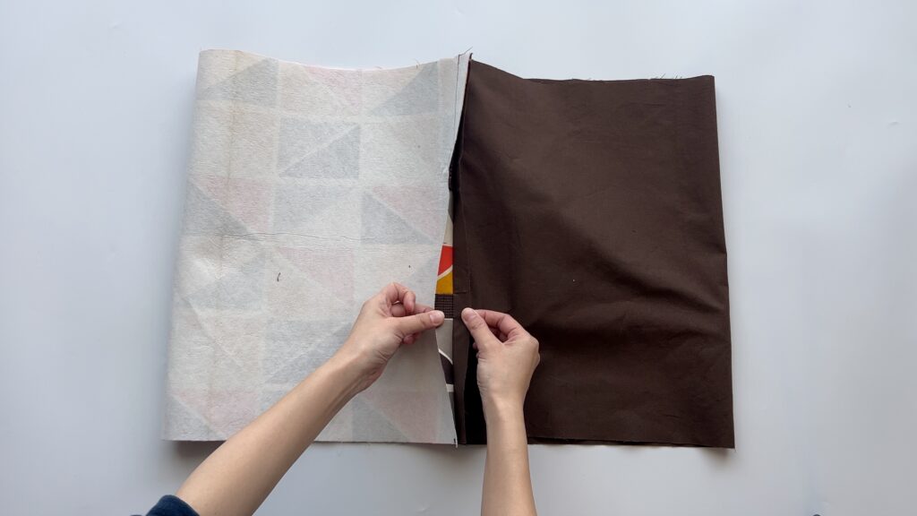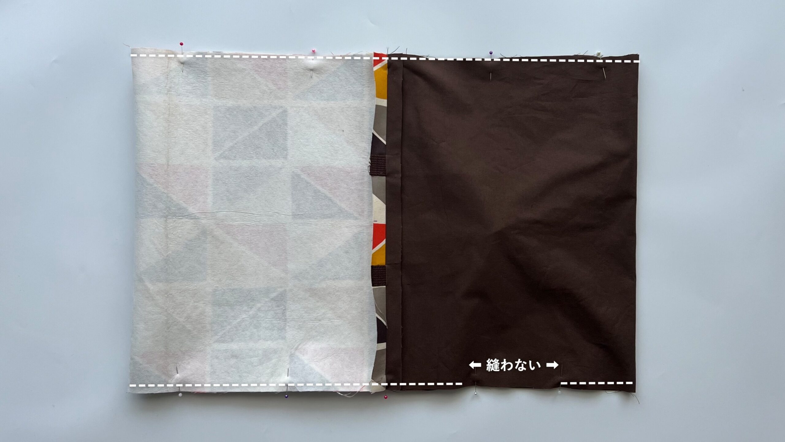 - 表地と裏地の境い目(先ほど2cmで縫った部分)の位置をぴったり合わせ、マチ針やクリップで固定します。