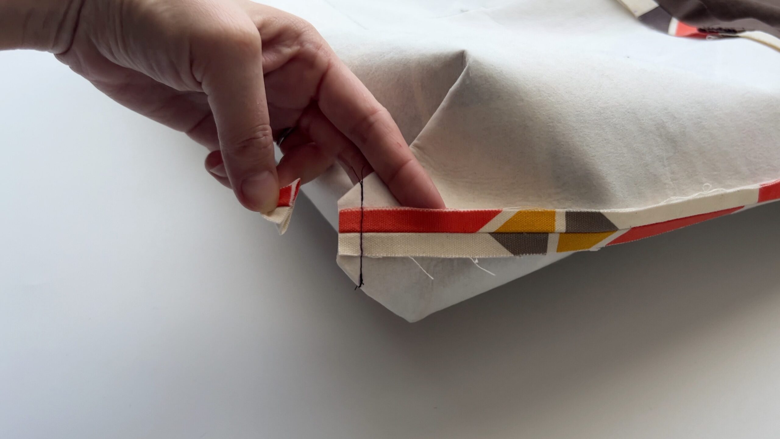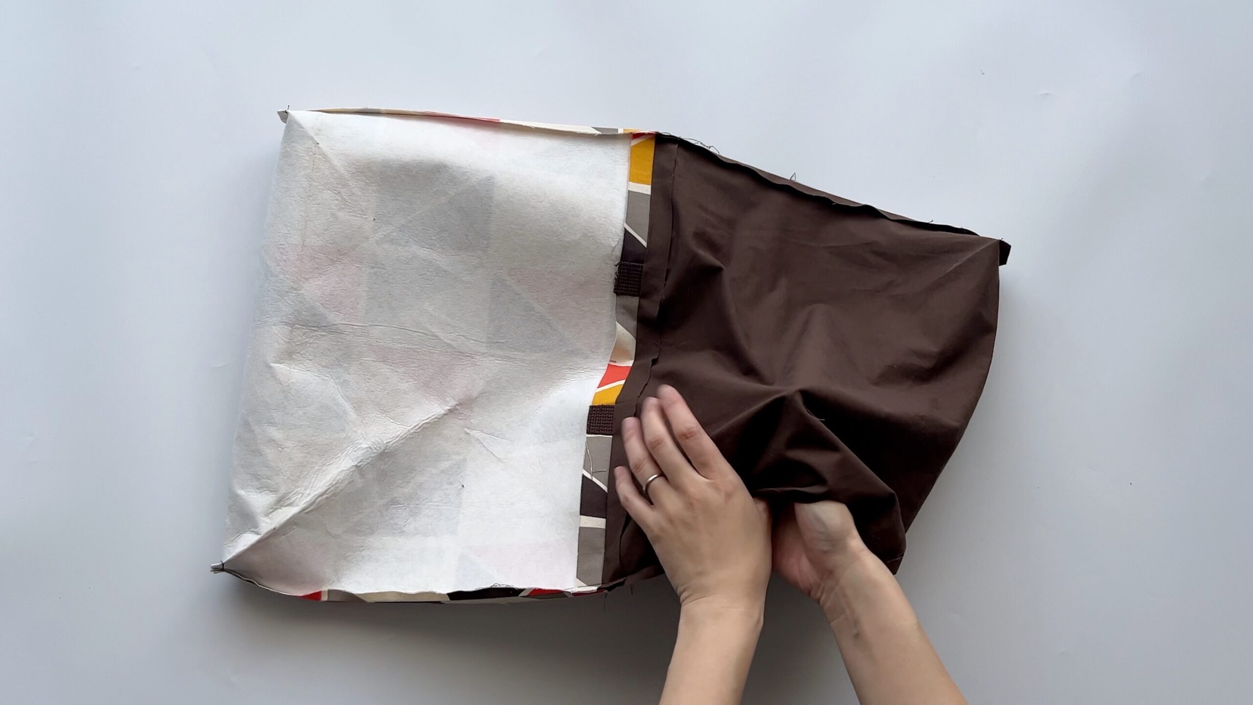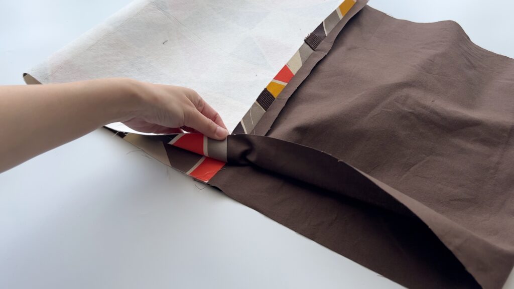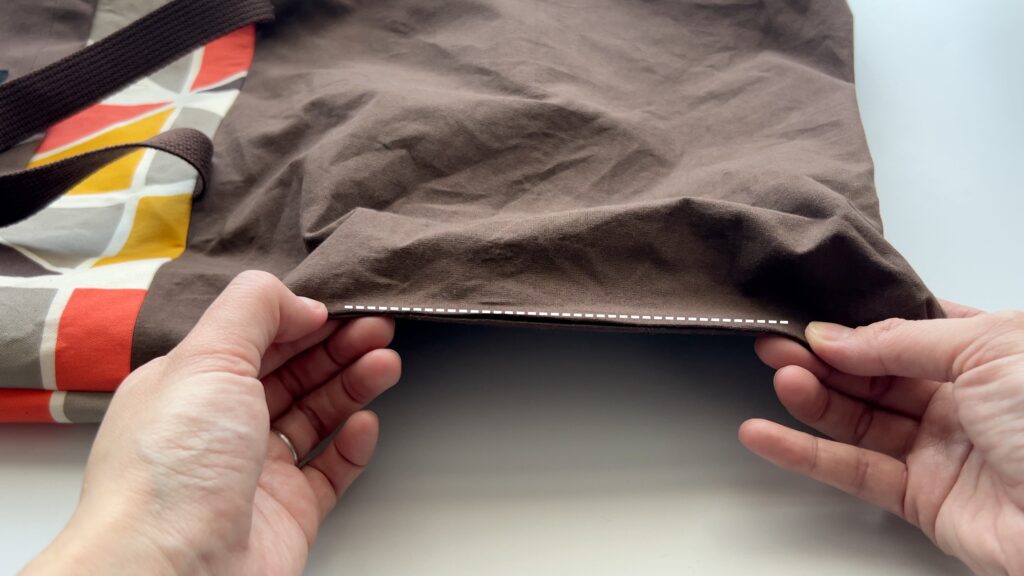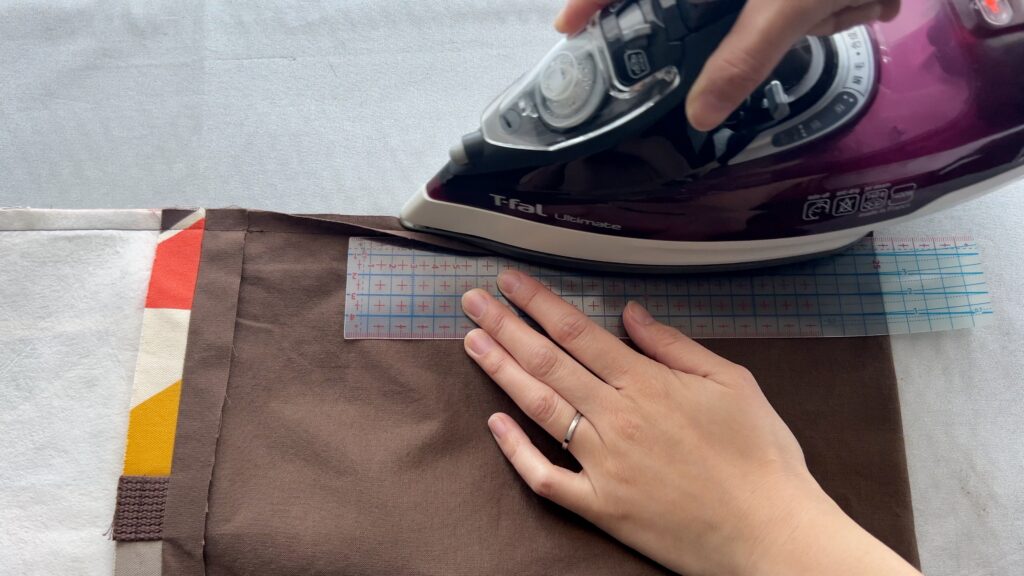 - 裏地をバッグの中に綺麗に収めます。表から裏地の生地が見えないように、内側にきっちり折り込み、アイロンでしっかりと押さえます。