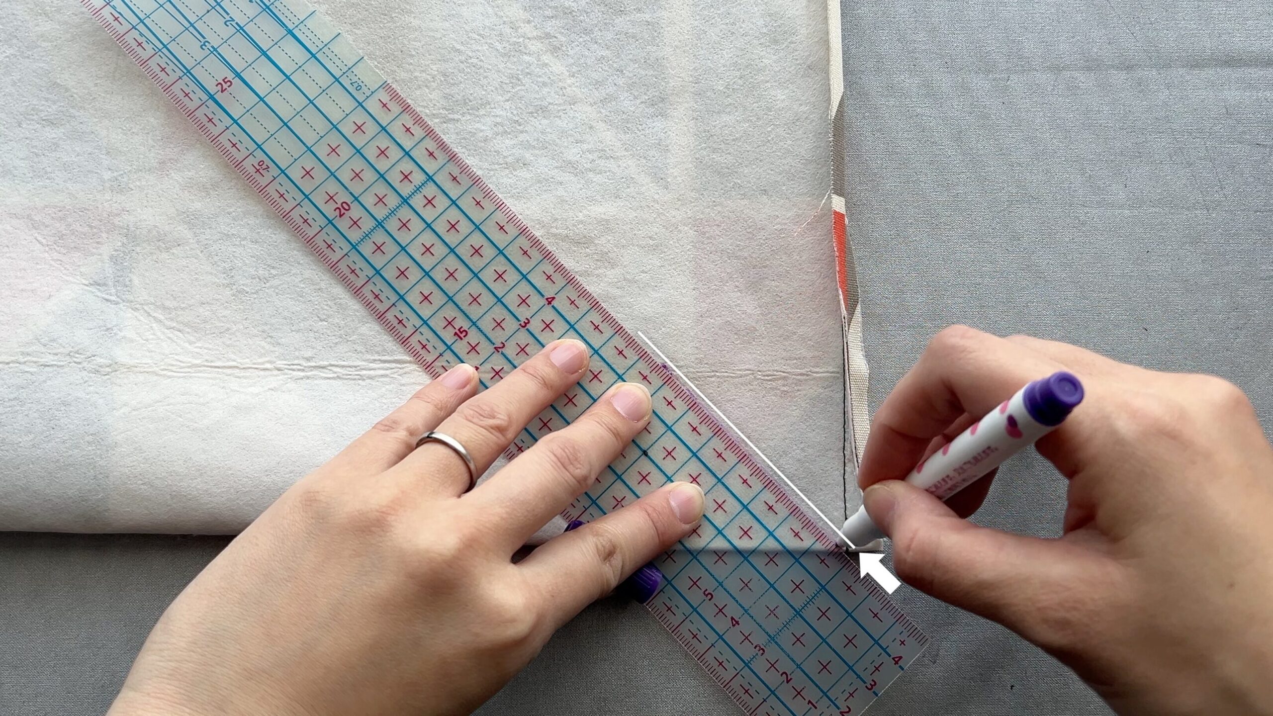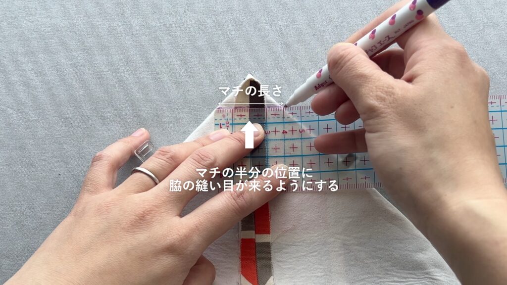 - 四隅の角に、マチの長さの線を引いていきます。マチの半分の長さの位置に脇の縫い目が来るように調整し、脇の縫い目と垂直に交わるように定規を当てます。今回はマチ4cmなので、2cmの位置に脇の縫い目が来るようにします。