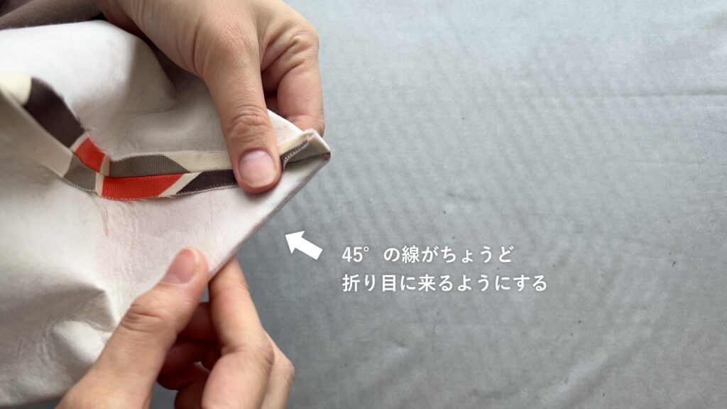 - 角の部分を畳み直し、脇の縫い目が畳んだ角の中心に来るようにします。この時、最初に引いた斜め45°の線がちょうど折り目になっていればOKです。