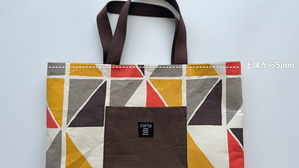 - バッグの口部分の端から5mmの位置に、ぐるっと一周ステッチを入れます。
